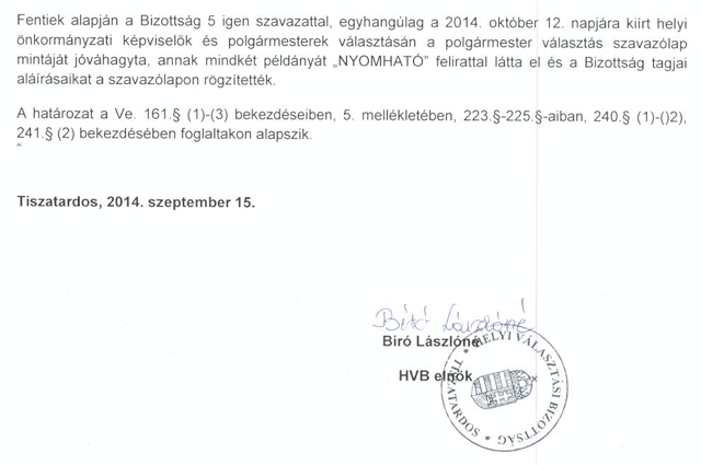 Tiszatardos Helyi Választási Bizottság Jegyzőkönyv 2014
